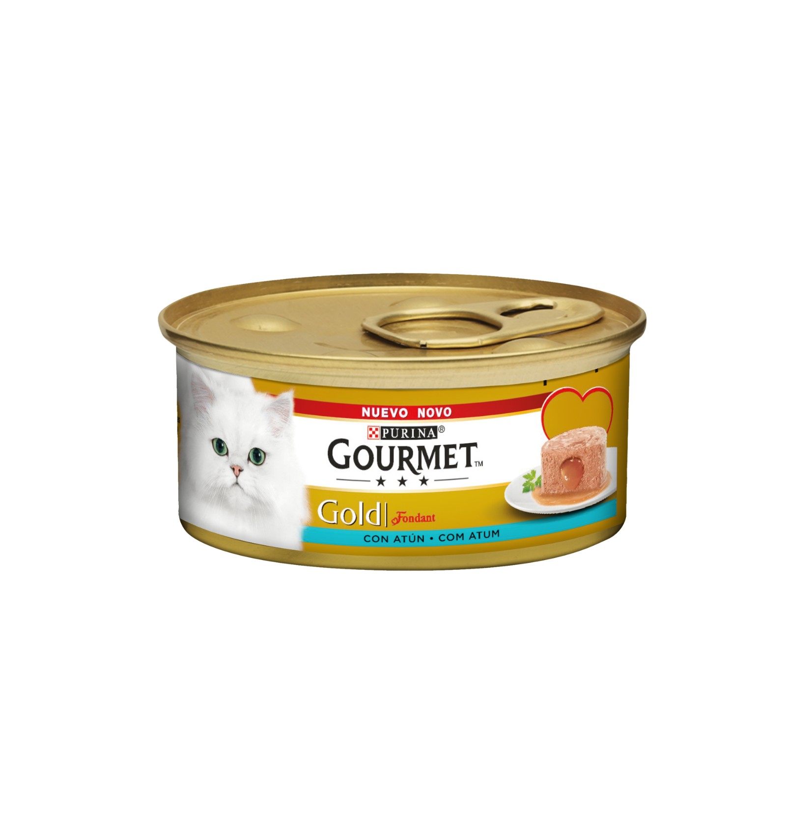 Gourmet Gold Fondant é uma gama de suaves e irresistíveis mousses com salmão, atum e outros requintados sabores, com um surpreendente recheio derretido no interior para tornar a refeição do seu gato ainda mais especial.