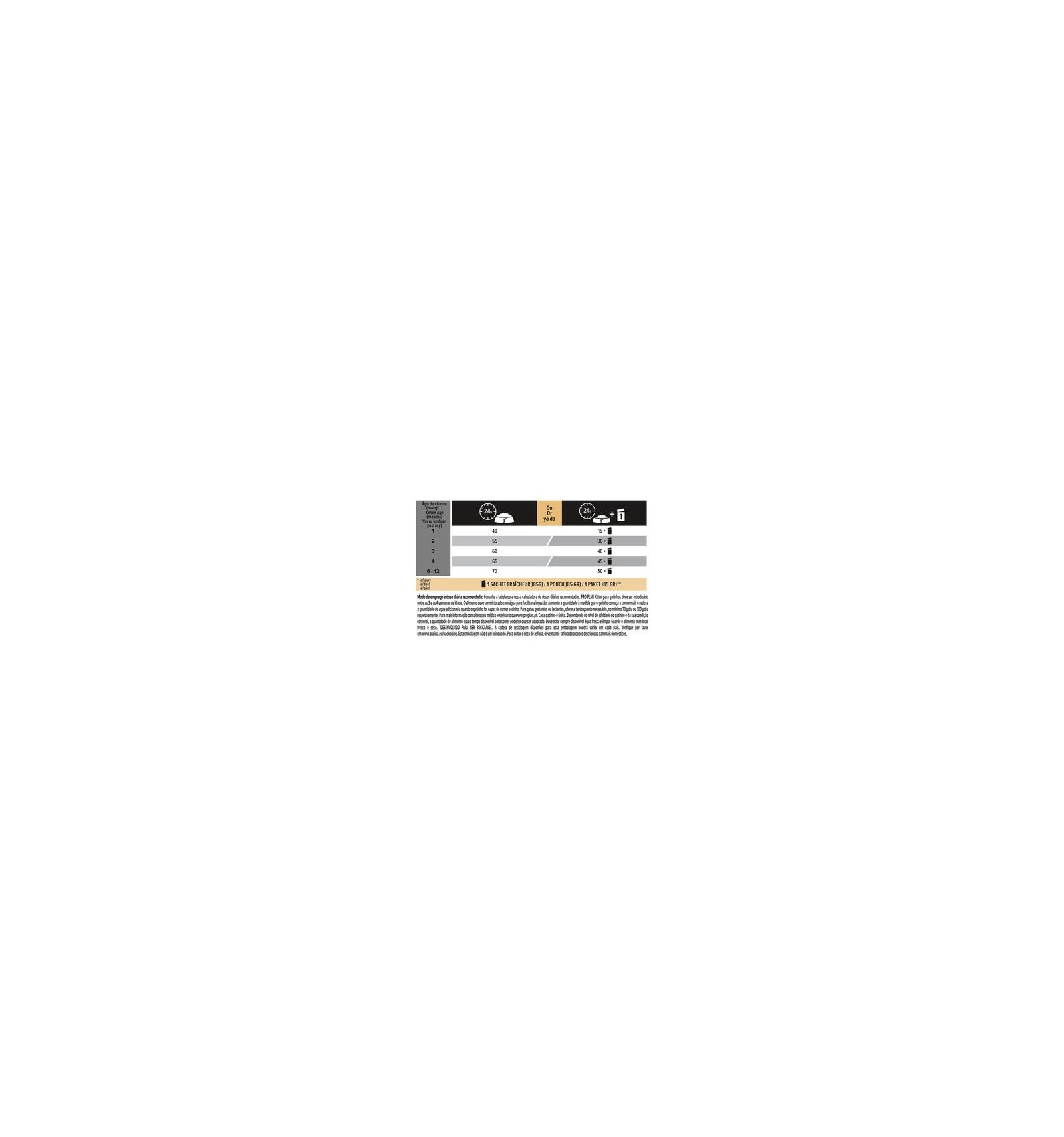 | Dose diária recomendada (g/dia): Idade do Gatinho (meses) | Quantidado Alimento Seco (g) | Alimento Seco + Húmido Quantidade (g) + 1 SAQUETA (85g) |