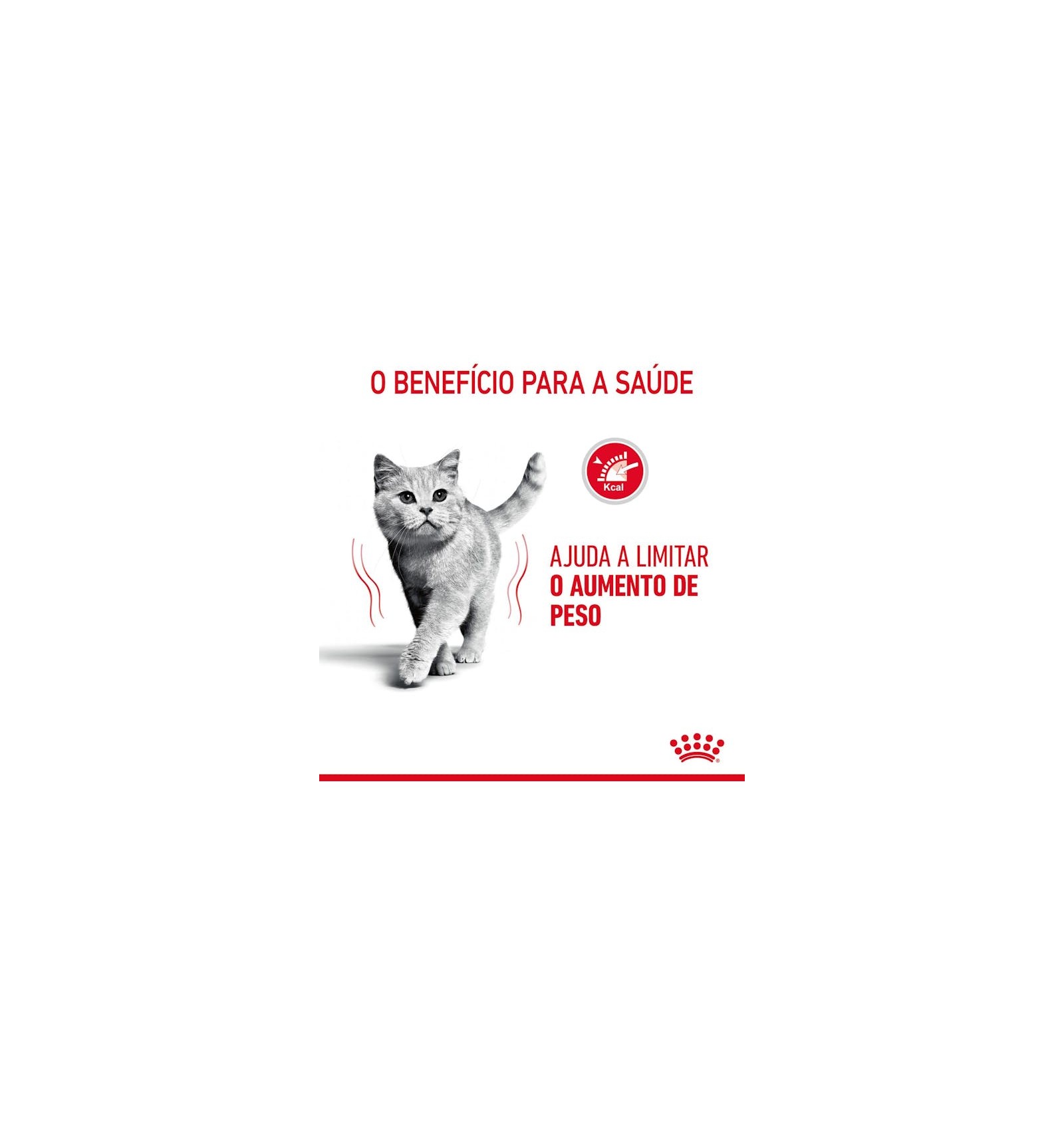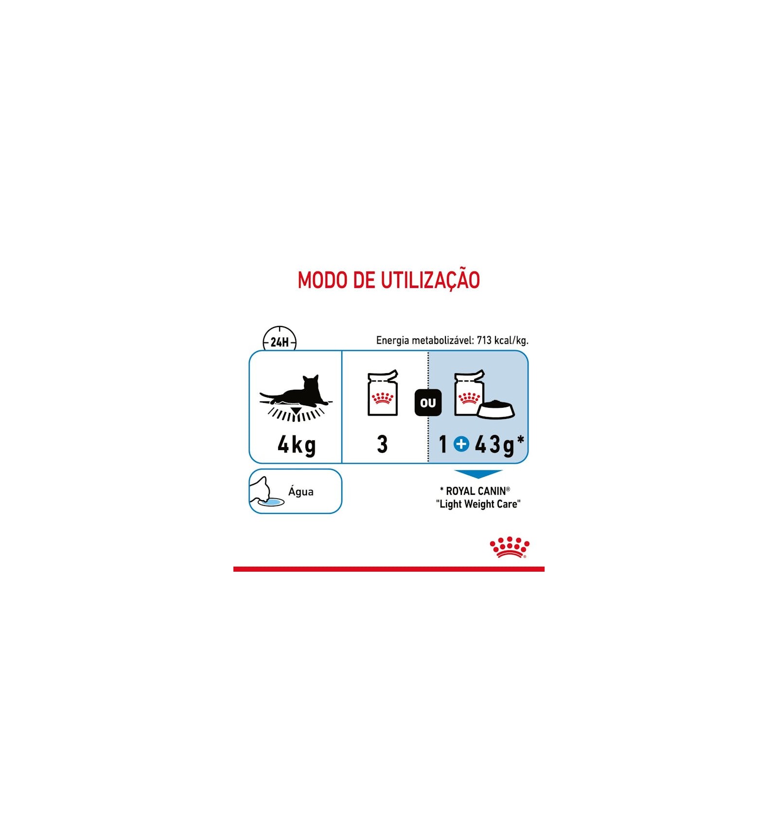 ROYAL CANIN® LIGHT WEIGHT CARE Esta fórmula proporciona uma nutrição equilibrada e precisa para ajudar a manter uma condição corporal saudável, por várias ações: - Teor proteico adaptado para ajudar a manter a massa muscular e um peso saudável. - Enriquecido com L-carnitina, que contribui para um metabolismo saudável das gorduras. - Nutrição formulada para satisfazer o seu gato e ajudar a manter uma condição corporal saudável.