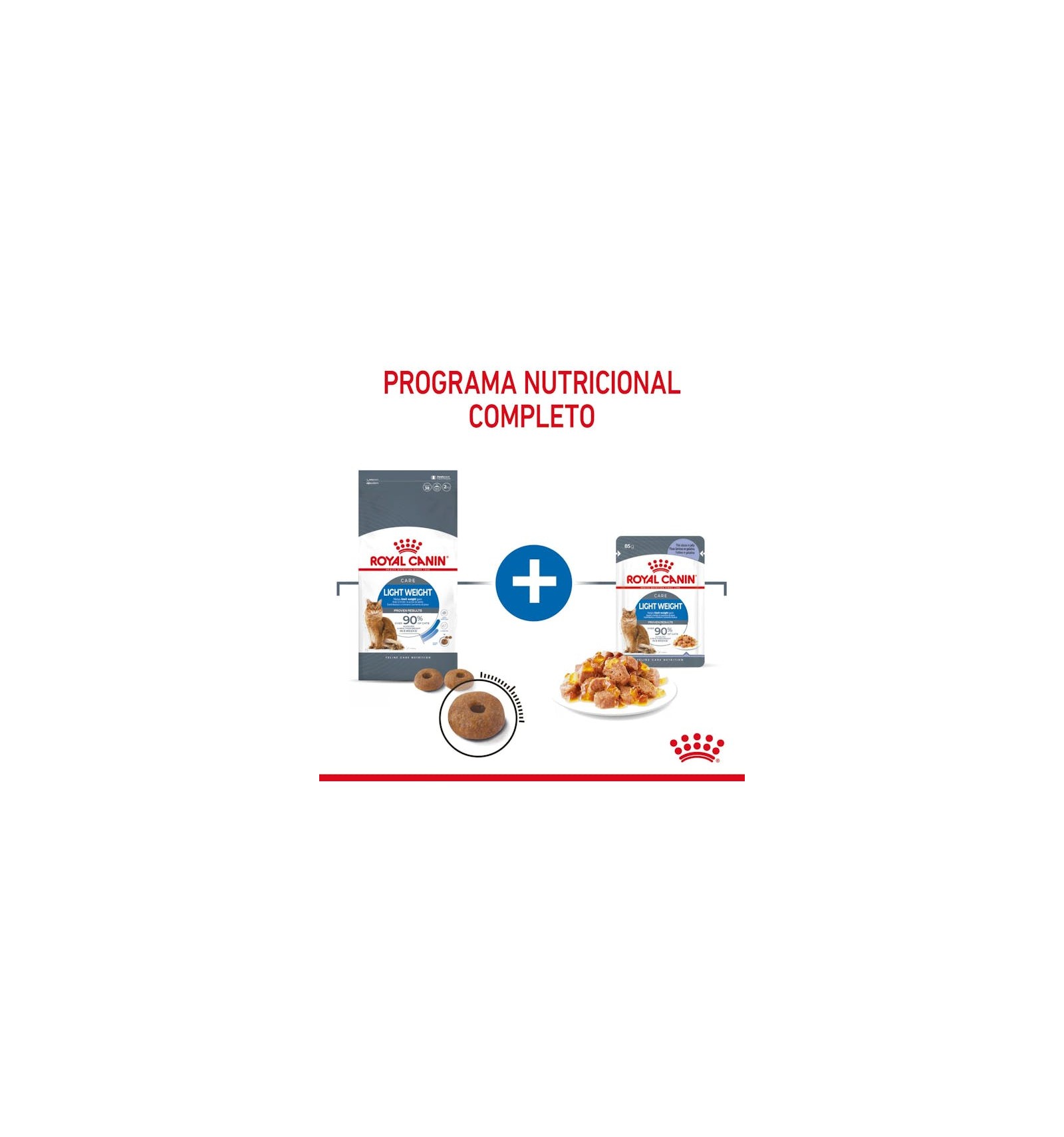 PROGRAMA DE CONTROLO DE PESO: 1. Fornecer nutrição completa e balanceada com os nossos alimentos ROYAL CANIN® LIGHT WEIGHT CARE húmida e seca, permite-lhe escolher a combinação perfeita para o seu gato. 2. Mantenha o seu gato ativo com jogos em casa e comedouros do tipo quebra-cabeças. 3. Evite alimentos para humanos e guloseimas calóricas ou ricas em gordura. 4. Se tiver dúvidas ou preocupações sobre a saúde do seu gato, contacte o seu médico veterinário.