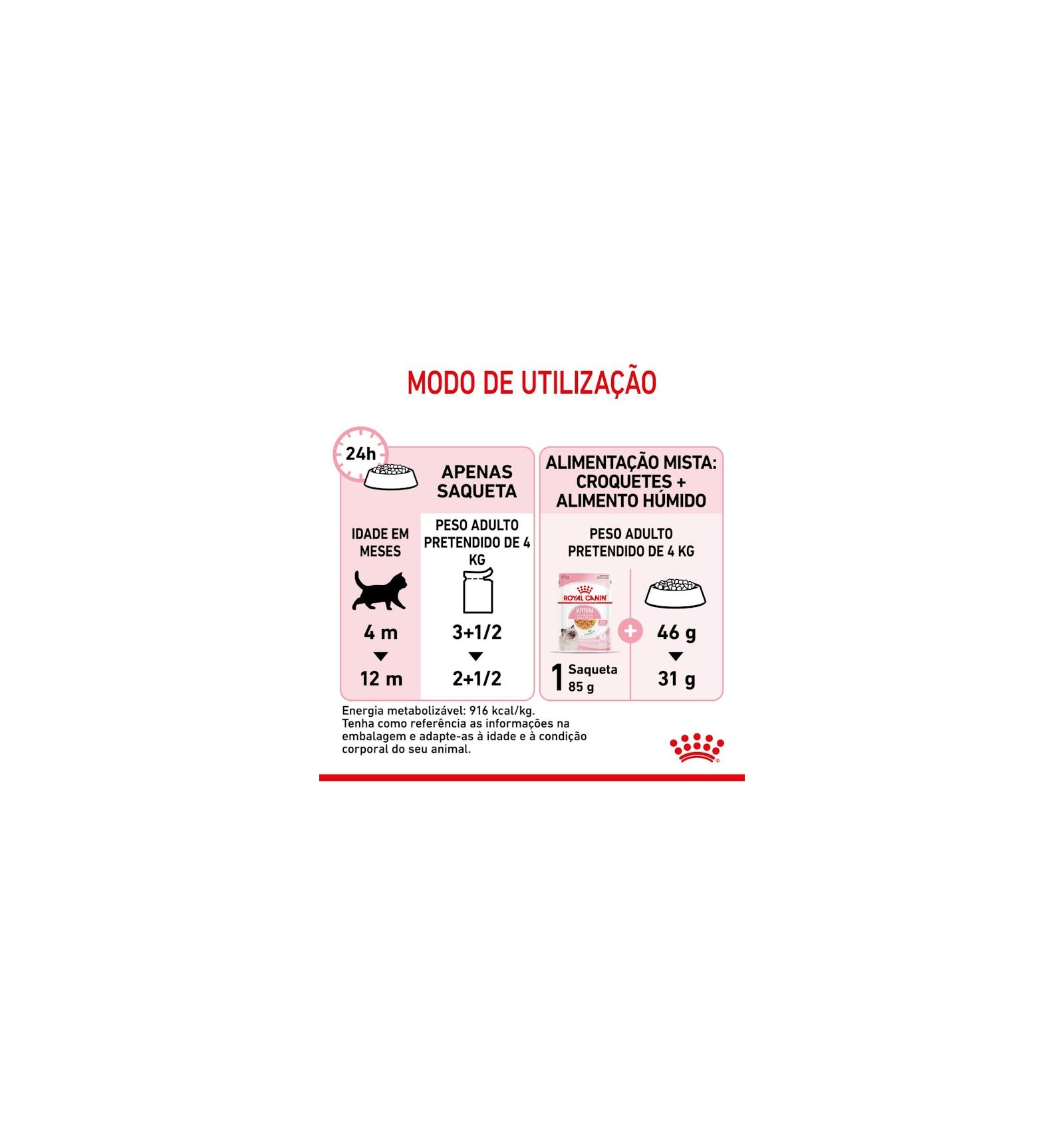 Quando o seu gatinho atingir os 12 meses de idade, precisará de um alimento especialmente adaptado para satisfazer as suas necessidades nutricionais como gato adulto. Nesta fase, pode fazer a transição para a gama de alimentos ROYAL CANIN® para gatos adultos, disponíveis em alimento seco ou alimento húmido em diferentes texturas: patê, pedaços em molho ou pedaços em geleia.
