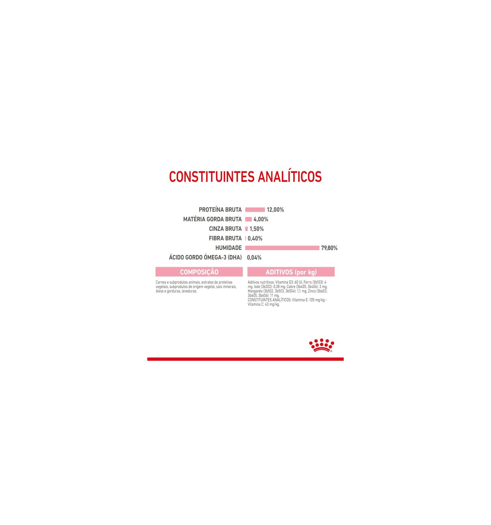 ADITIVOS (por kg): Aditivos nutritivos: Vitamina D3: 175 UI, E1 (Ferro): 3 mg, E2 (Iodo): 0,38 mg, E4 (Cobre): 3 mg, E5 (Manganésio): 1 mg, E6 (Zinco): 10 mg.