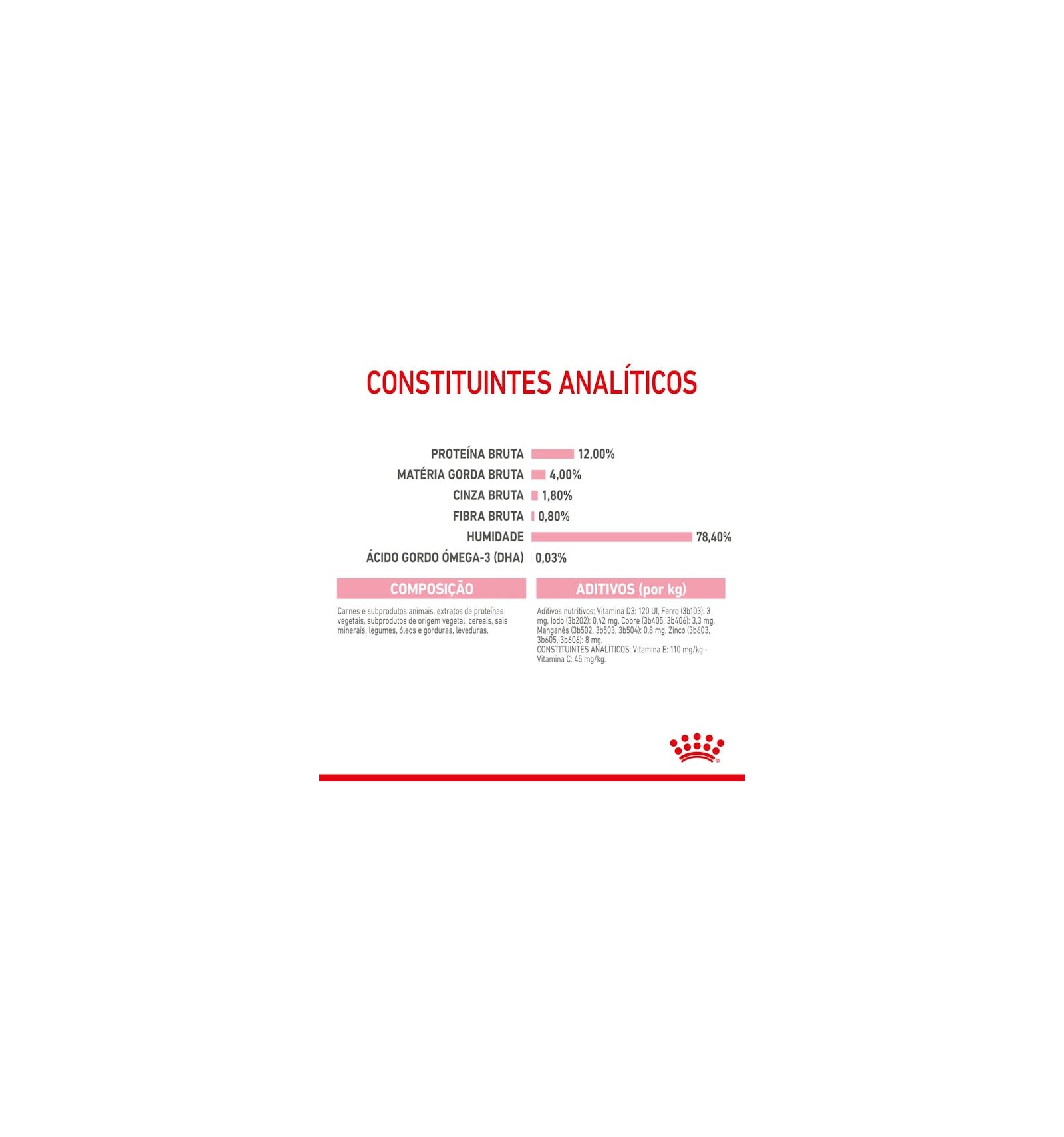 ADITIVOS (por kg): Aditivos nutritivos: Vitamina D3: 120 UI, Ferro (3b103): 3 mg, Iodo (3b202): 0,42 mg, Cobre (3b405, 3b406): 3,3 mg, Manganês (3b502, 3b503, 3b504): 0,8 mg, Zinco (3b603, 3b605, 3b606): 8 mg.