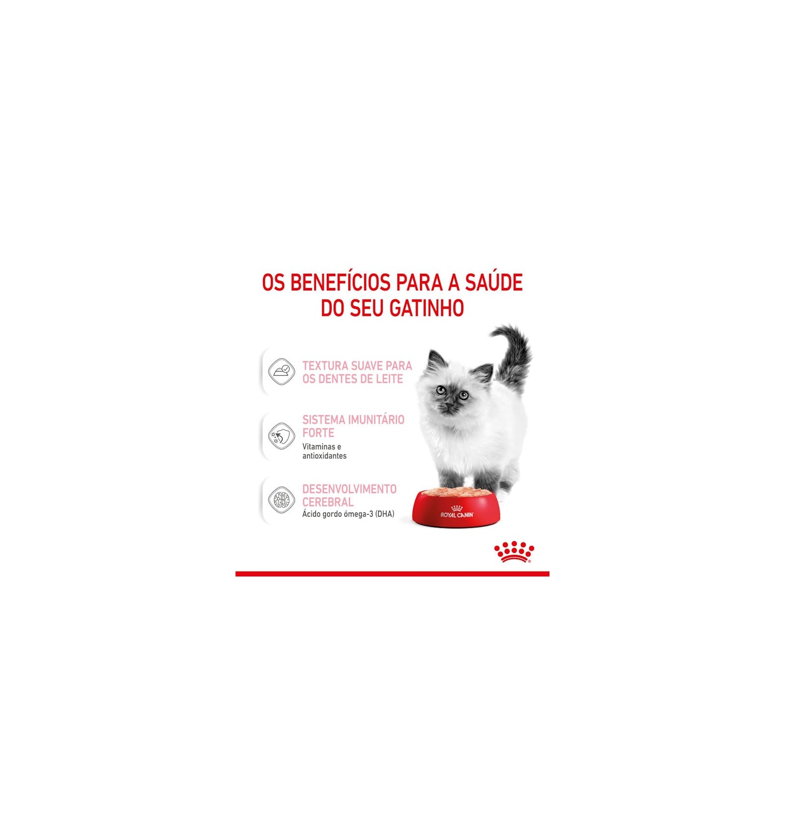 O ROYAL CANIN® Kitten patê é também enriquecido com ácidos gordos Ómega-3 (DHA) para apoiar o desenvolvimento cerebral e promover uma visão saudável.