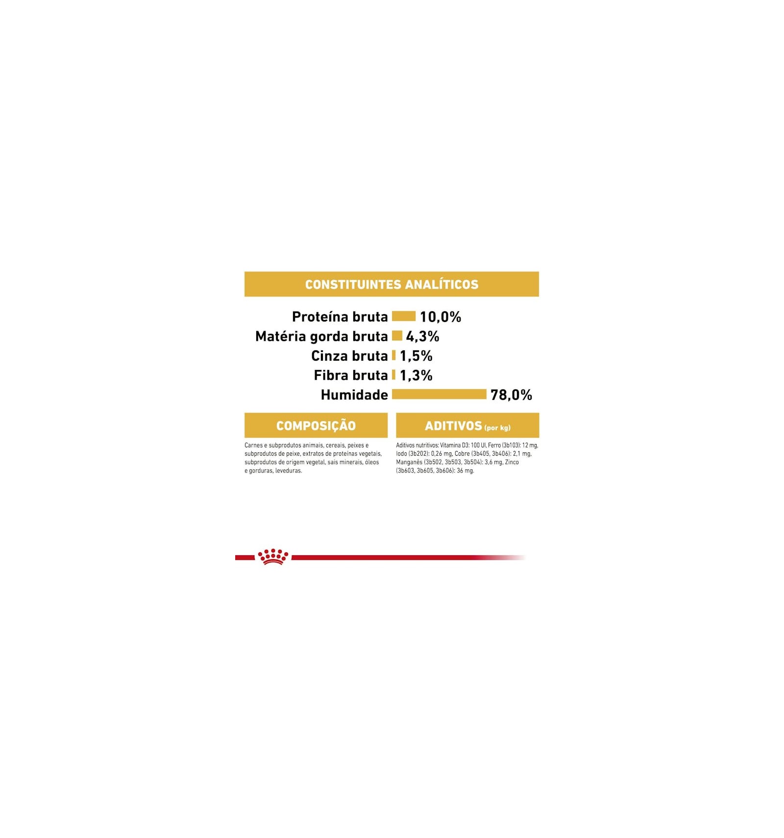 Proteína bruta: 10,0% - Fibra bruta: 1,3% - Matéria gorda bruta: 4,3% - Cinza bruta: 1,5% - Humidade: 78,0% - Energia metabolizável: 939 kcal/kg.