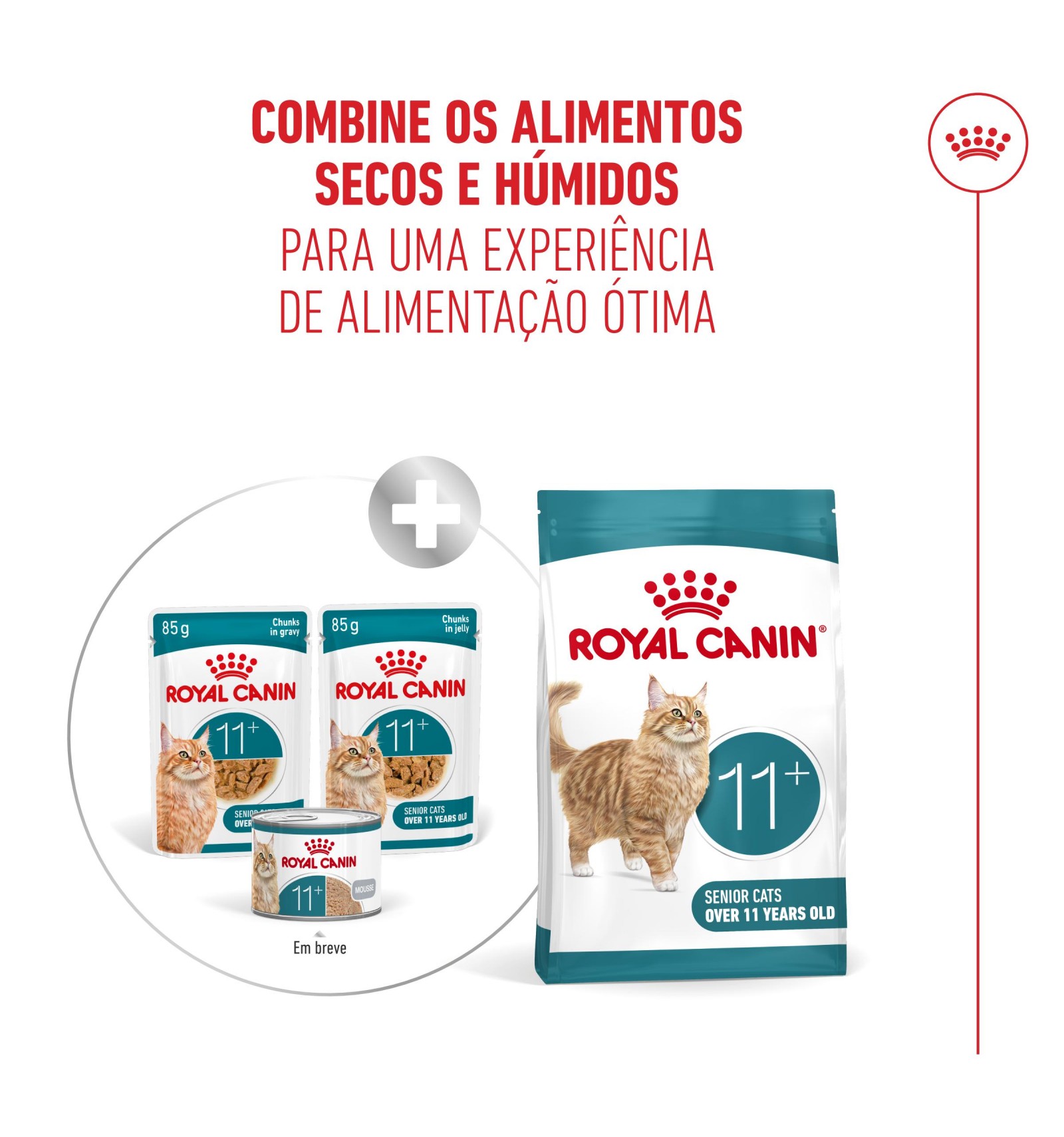 O ROYAL CANIN® AGEING 11+ está disponível em texturas diferentes, incluindo pedaços com molho, mousse ultra suave e croquetes. Estas opções podem contribuir para que desfrutem das refeições, e trazer mais variedade à dieta do seu gato, tornando-as ideais para uma abordagem de alimentação mista e equilibrada.