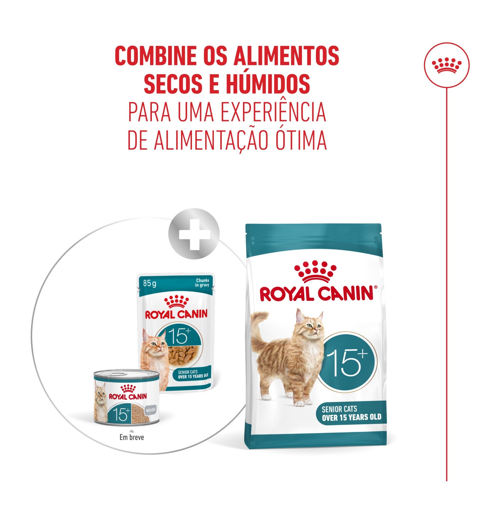 O ROYAL CANIN® AGEING 15+ está disponível em texturas diferentes, incluindo mousse ultra suave e croquetes. Estas opções podem contribuir para que desfrutem das refeições, e trazer mais variedade à dieta do seu gato, tornando-as ideais para uma abordagem de alimentação mista e equilibrada.