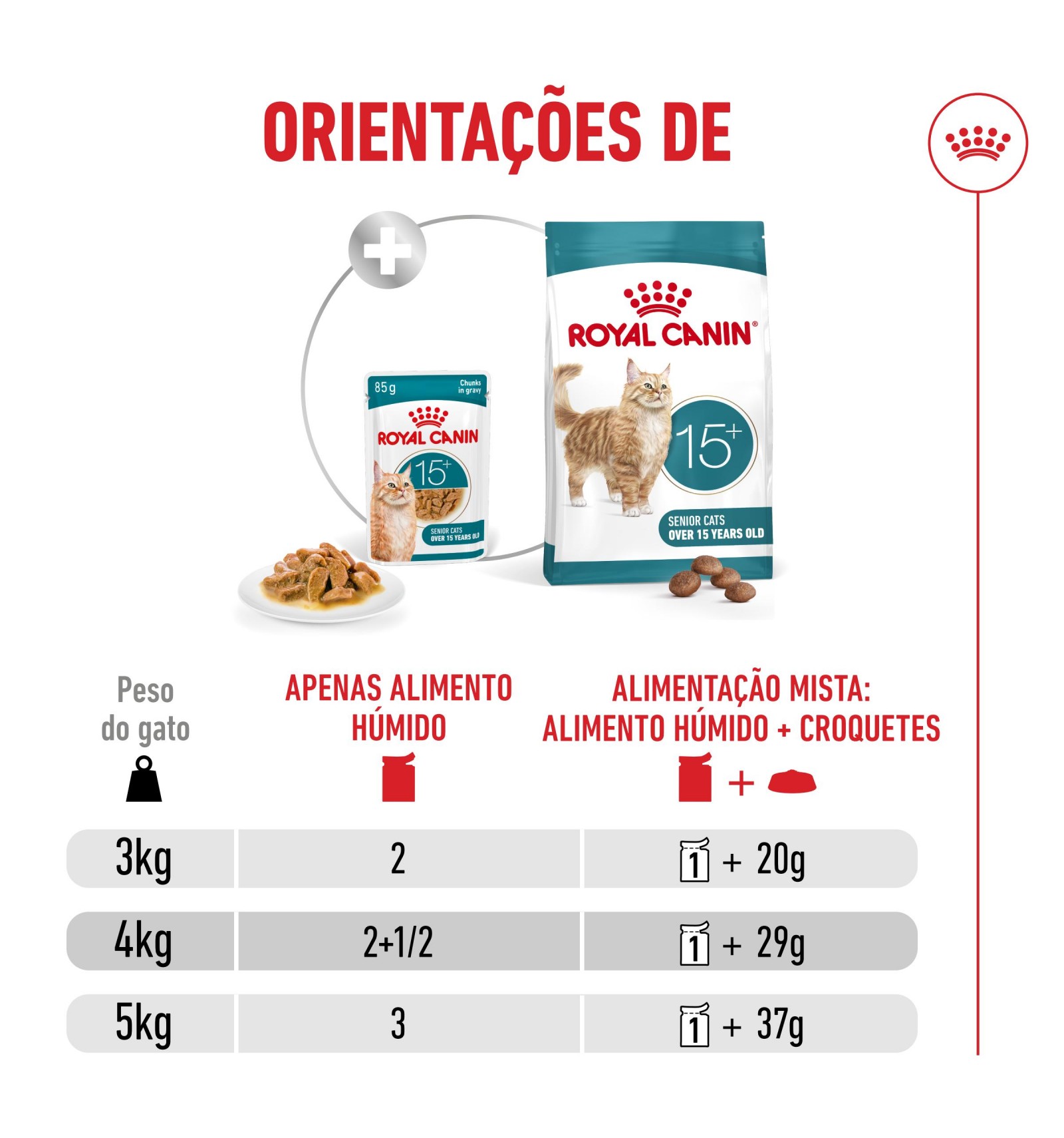 O ROYAL CANIN® AGEING 15+ pedaços com molho é um alimento húmido destinado aos gatos com mais de 15 anos. Esta fórmula oferece uma combinação precisa e equilibrada de nutrientes para ajudar a satisfazer as necessidades relativas à idade avançada do seu gato.
