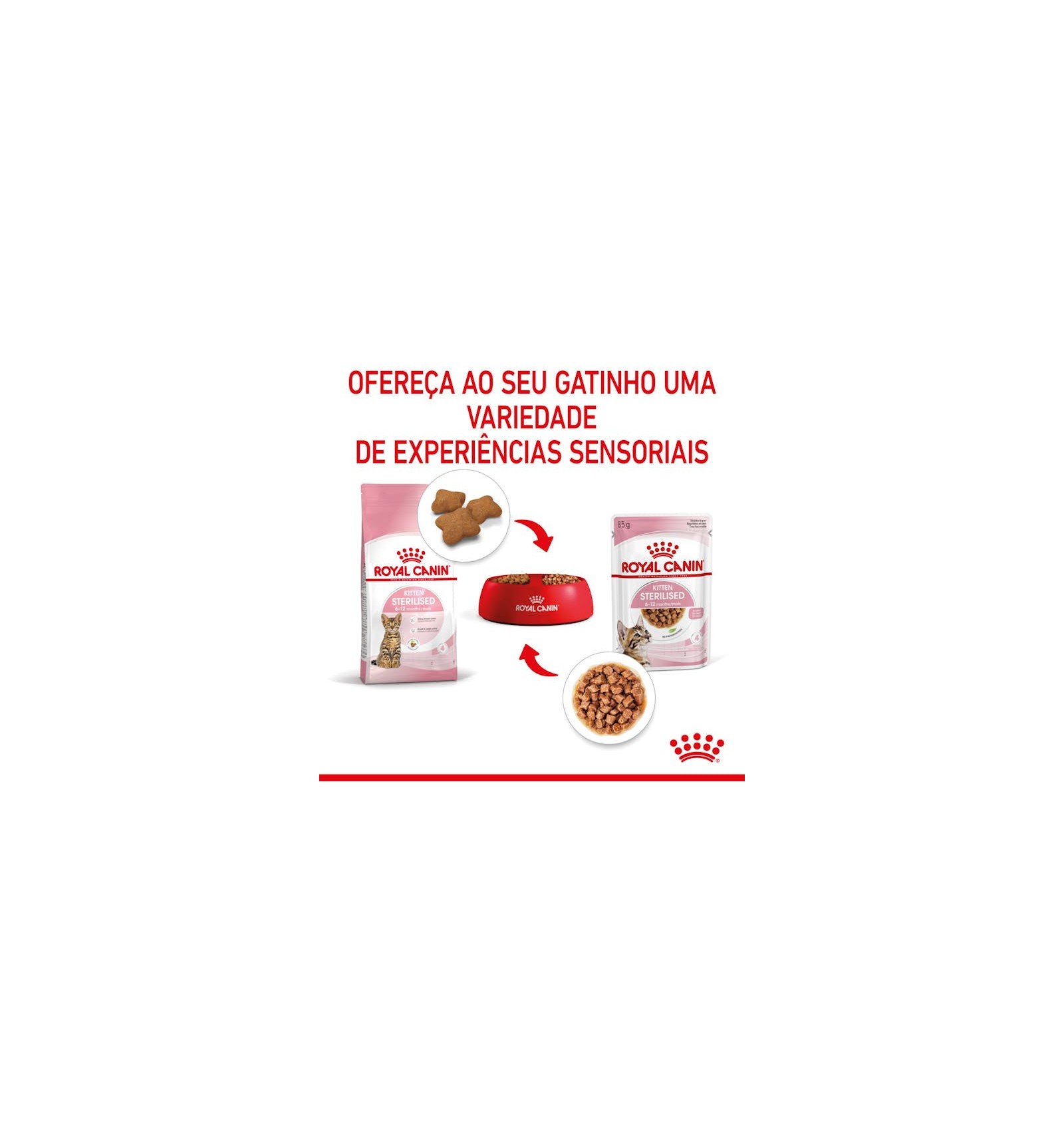 O ROYAL CANIN® Kitten Sterilised em molho foi desenvolvido para satisfazer o mais requintado paladar felino. Este alimento húmido proporciona ao seu gatinho esterilizado uma experiência sensorial positiva, promove uma hidratação saudável e é perfeito para a alimentação mista com alimento seco ROYAL CANIN® Kitten Sterilised.