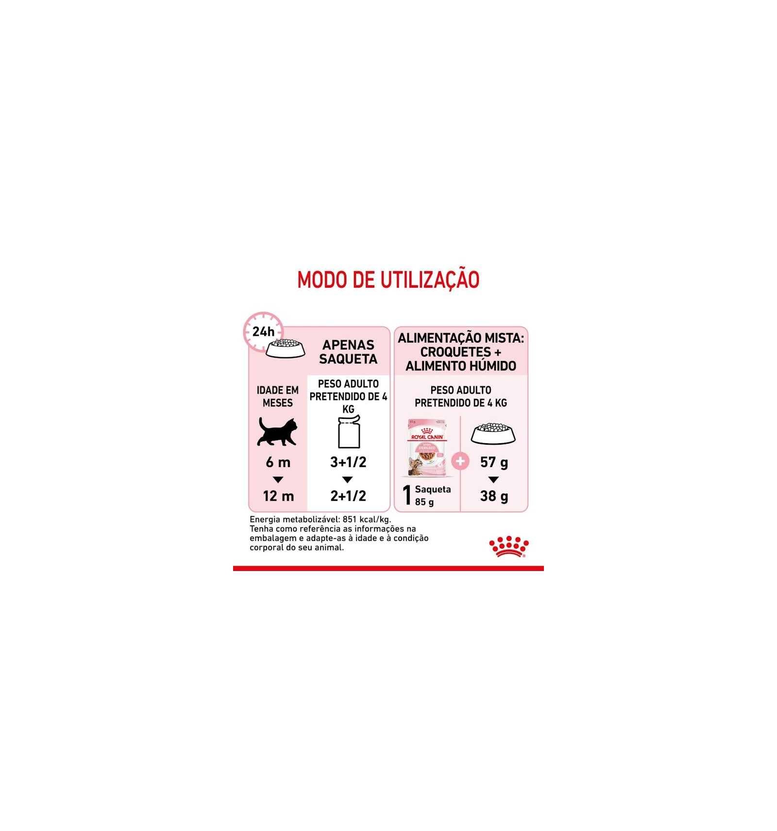 Quando o seu gatinho esterilizado atingir os 12 meses de idade, precisará de um alimento especialmente adaptado para satisfazer as suas necessidades nutricionais como gato adulto. Nesta fase, pode fazer a transição para a gama ROYAL CANIN® Feline Health Nutrition Sterilised, disponível em alimento seco ou em alimento húmido com três texturas diferentes: pedaços em geleia, pedaços em molho ou patê