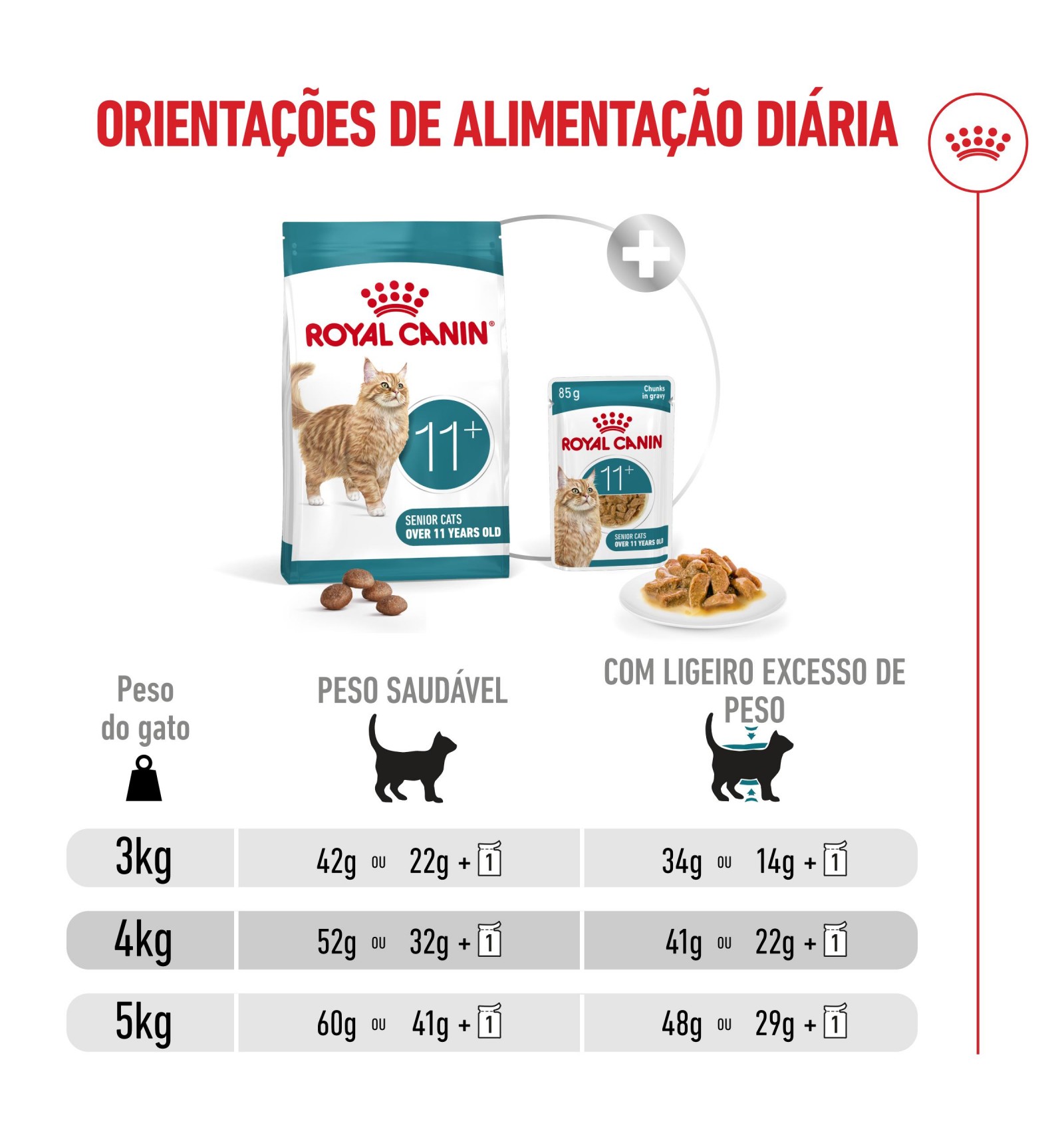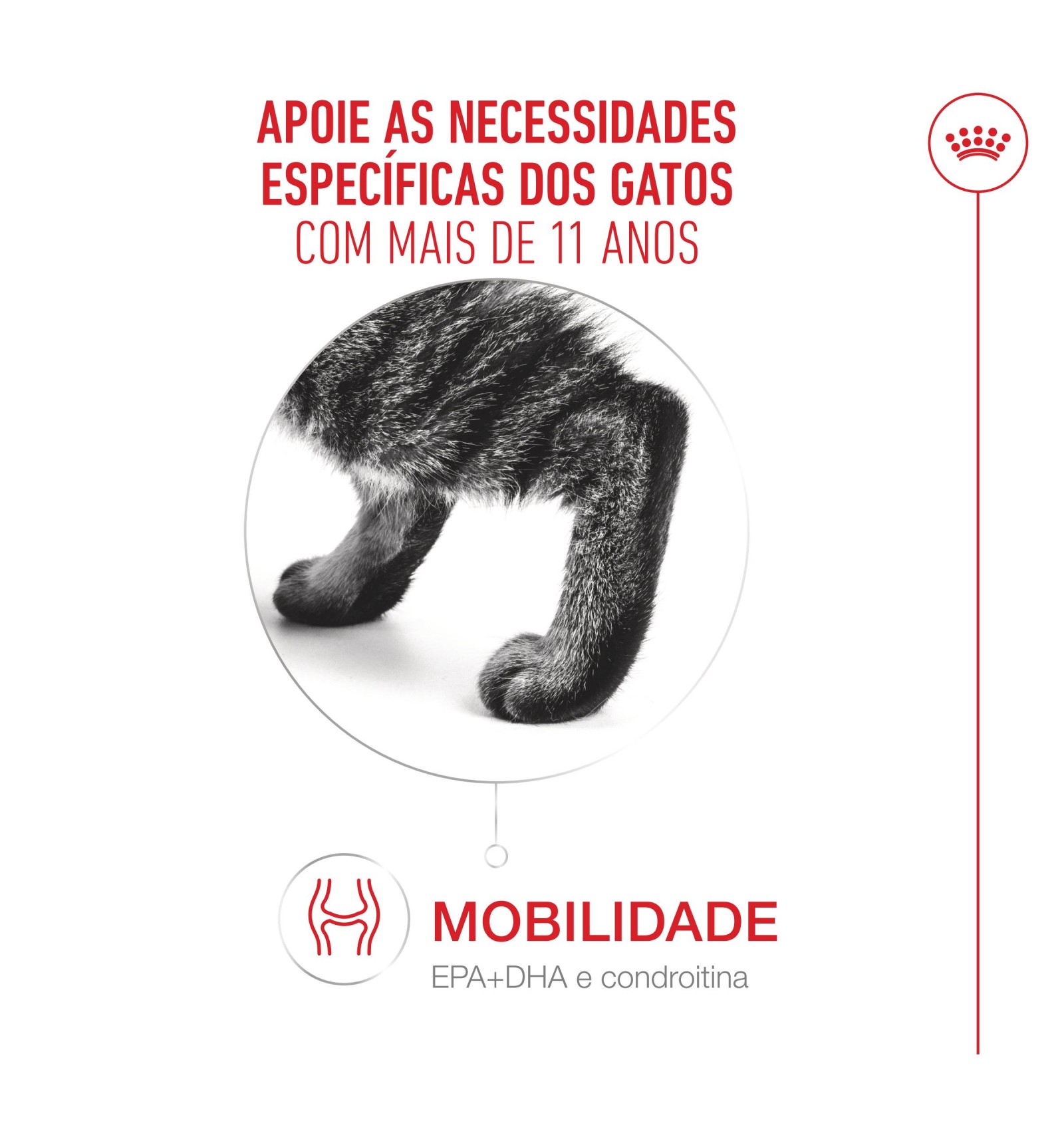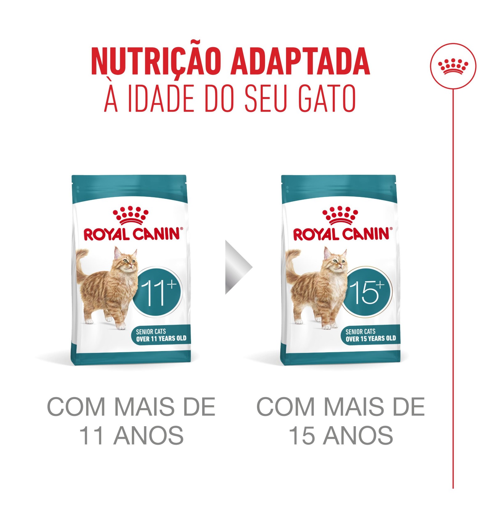 O ROYAL CANIN® AGEING 11+ é um alimento seco destinado aos gatos com mais de 11 anos. Concebido e testado para gatos seniores, o ROYAL CANIN® AGEING 11+ apresenta croquetes fáceis de comer para oferecer ao seu gato uma experiência de refeição agradável.