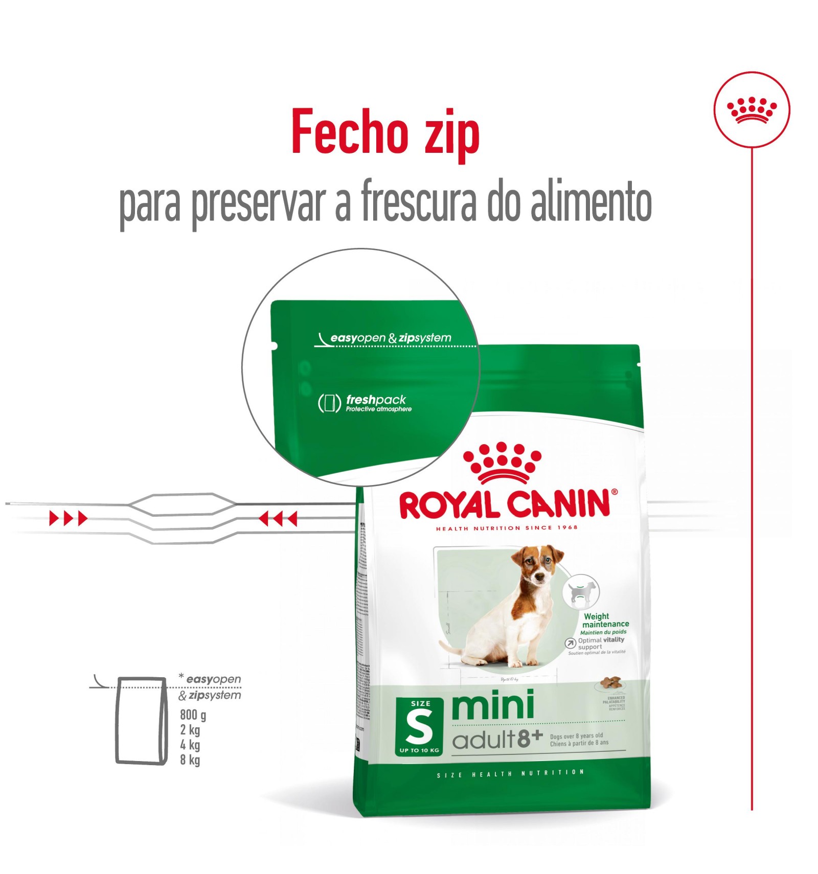 O ROYAL CANIN® Mini Adult 8+ é indicado para cães pequenos com mais de 8 anos e com um peso de até 10 kg.