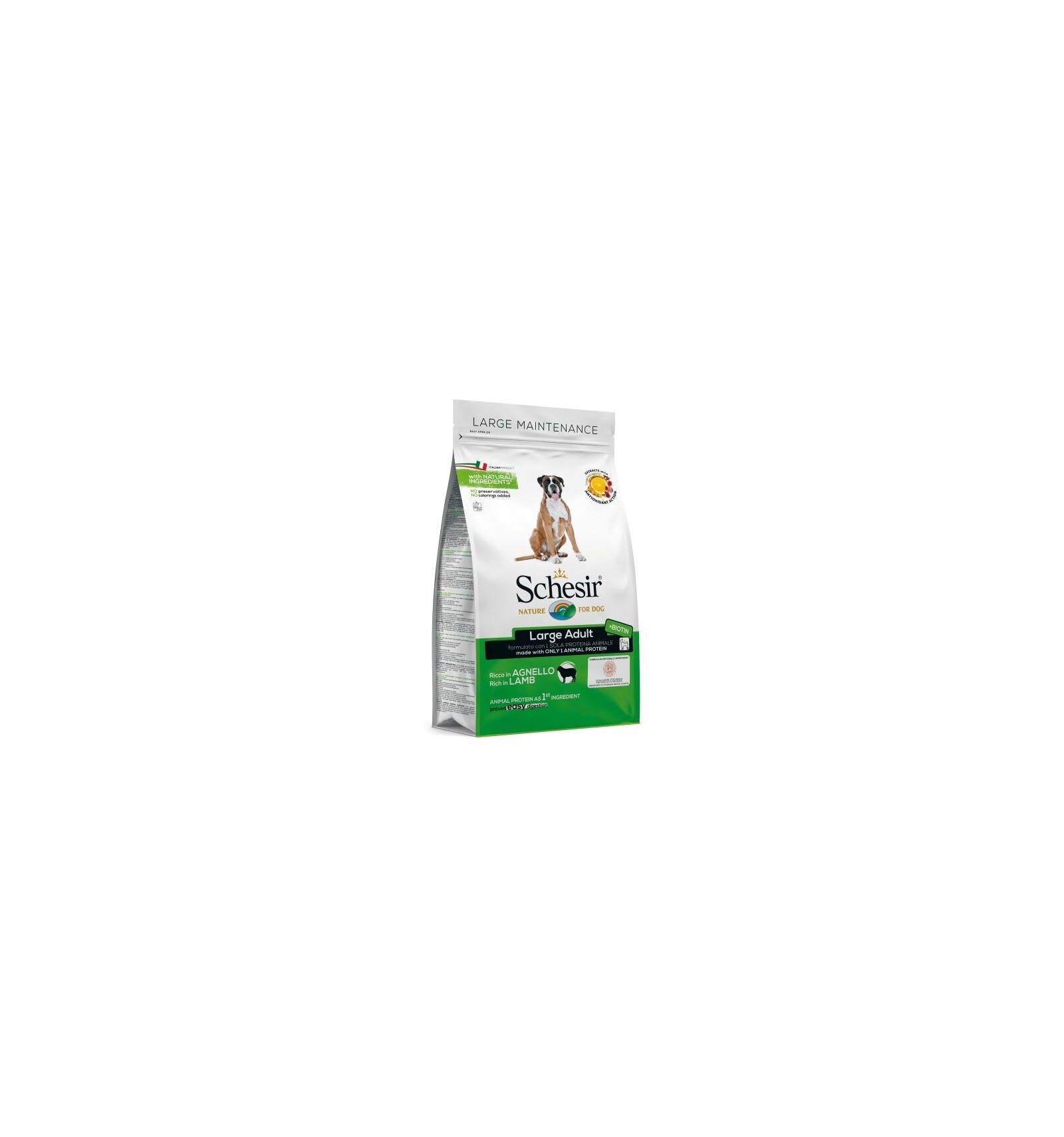 Uma receita Schesir que tem como ingrediente principal o cordeiro, que representa a única fonte proteica animal: um alimento saboroso, completo e balanceado, facilmente digerível, que satisfaz as exigências nutricionais dos cães adultos de porte grande. A presença de glucosamina e condroitina contribui a manter uma boa funcionalidade articular.
