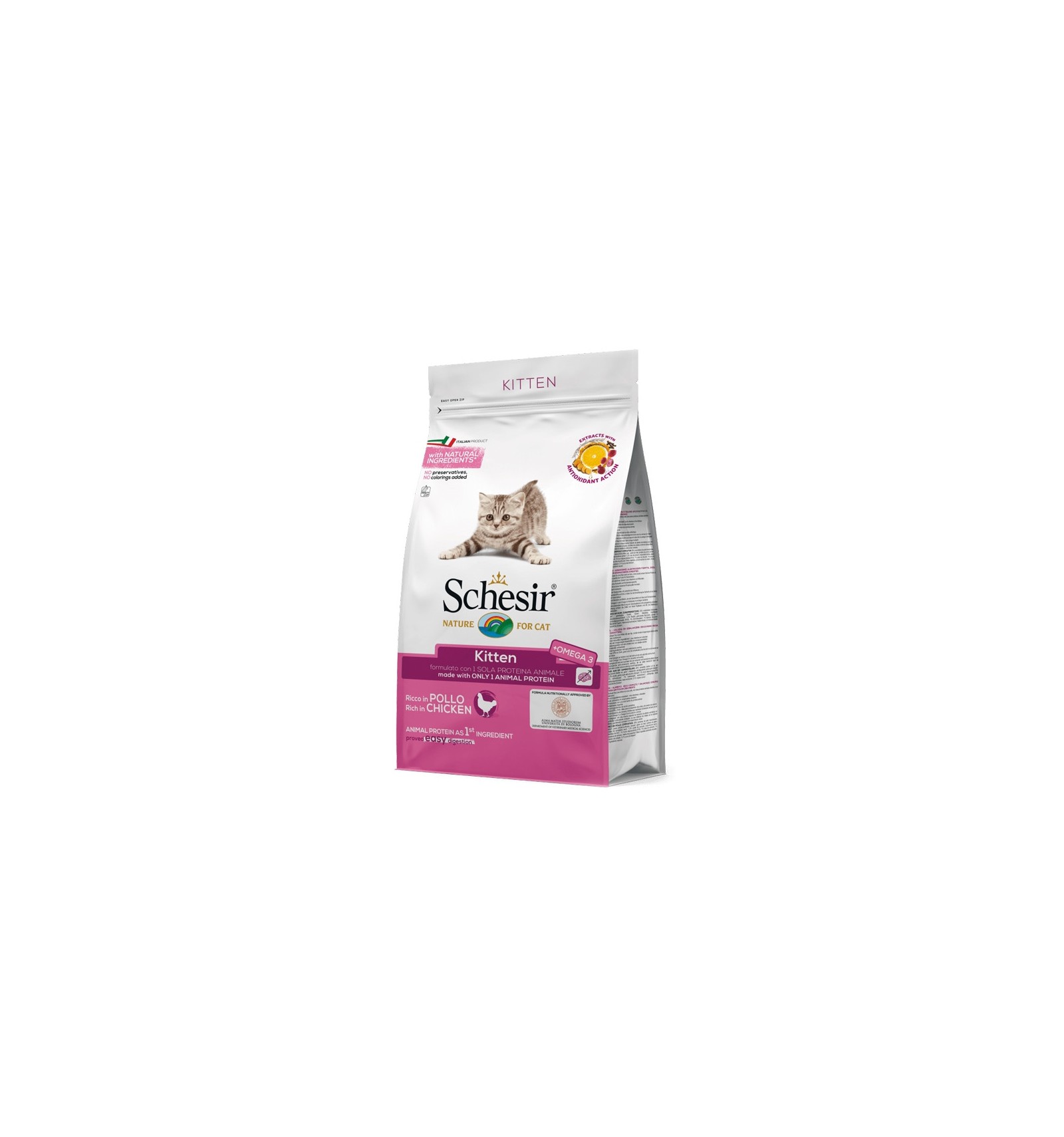Uma receita Schesir que tem como primeiro ingrediente o frango, que representa a única fonte proteica animal do produto: um alimento saboroso, completo e balanceado, facilmente digerível, que satisfaz as exigências nutricionais dos filhotes. Integrado com EPA e DHA, os mais importantes ácidos gordos polinsaturados do grupo Ómega 3, úteis para o desenvolvimento da visão e do cérebro dos gatinhos, no período pré e pós-natal. O consumo do produto Kitten com DHA é aconselhável também para a fêmea grávida e na fase de aleitamento.