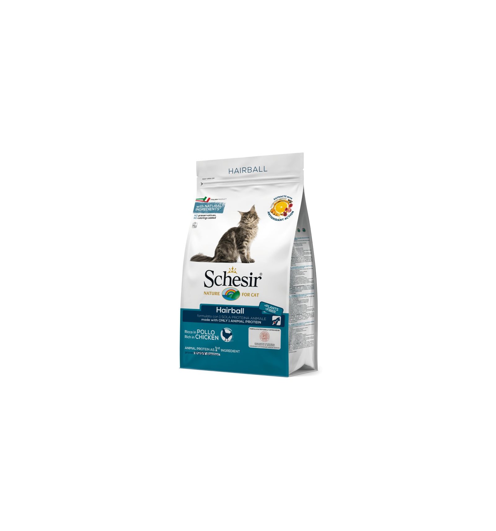 Uma receita Schesir que tem como primeiro ingrediente o frango, que representa a única fonte proteica animal do produto: um alimento saboroso, completo e balanceado, facilmente digerível, que satisfaz as exigências nutricionais dos gatos adultos com pelo longo. Em relação aos outros produtos da linha, tem um maior conteúdo de fibras, para favorecer a natural eliminação das bolas de pelo.