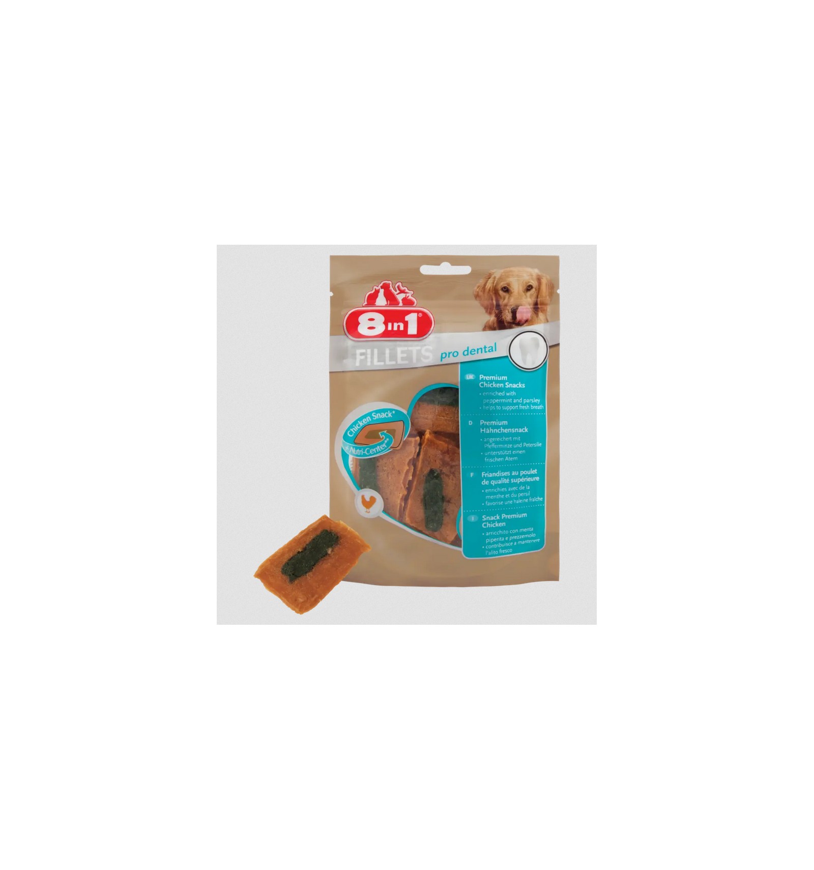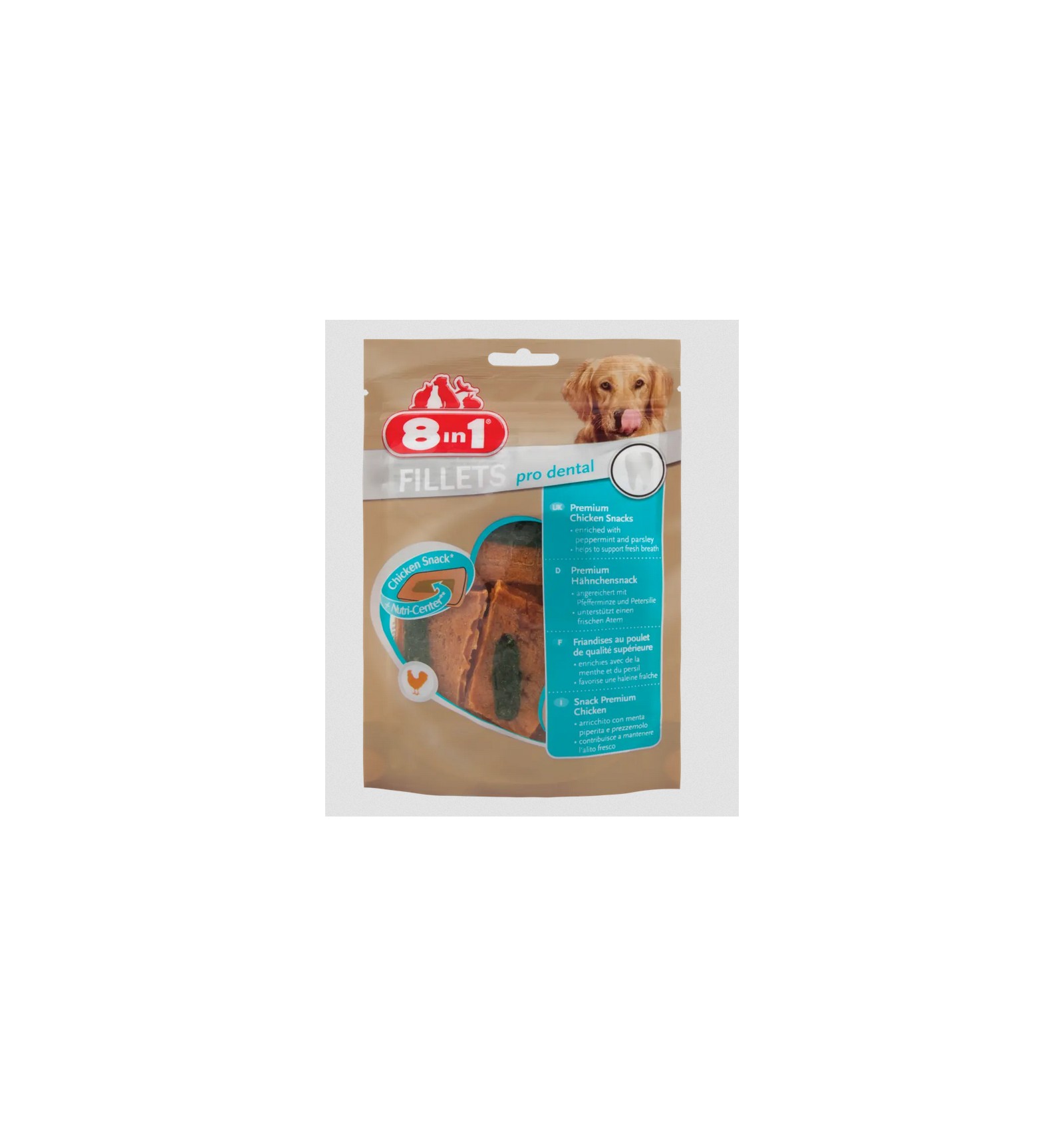 8in1 Fillets Pro Dental guloseimas são de qualidade premium, deliciosos lanches para o seu cão, com o benefício adicional de refrescar o hálito. 8in1 Filetes Pro não são apenas extremamente saborosos e com baixo teor de gordura; eles também oferecem ao seu cão um delicioso deleite com esse pouco mais. Estes lanches consistem em saborosa carne de frango com um núcleo nutricional especial, conhecido como o “Nutri-Centre”, que tem ingredientes saudáveis e funcionais para promover o bem-estar e a vitalidade do seu cão. O Nutri-Centre único foi enriquecido com sementes de hortelã-pimenta e salsa, ingredientes que têm sido tradicionalmente usados e reconhecidos como tendo qualidades de refrescantes de respiração. 8in1 Fillets Pro Dental contém apenas 4,5% de gordura e são uma recompensa saudável para entre as refeições. O saco resealable significa que você pode levar esses lanches com você quando estiver fora de si ou em viagens. O 8in1 Fillets Pro também está disponível em quatro variedades de sabores: Pro Active, Pro Digest e Pro Skin & Coat, para atender às necessidades de cada cão.