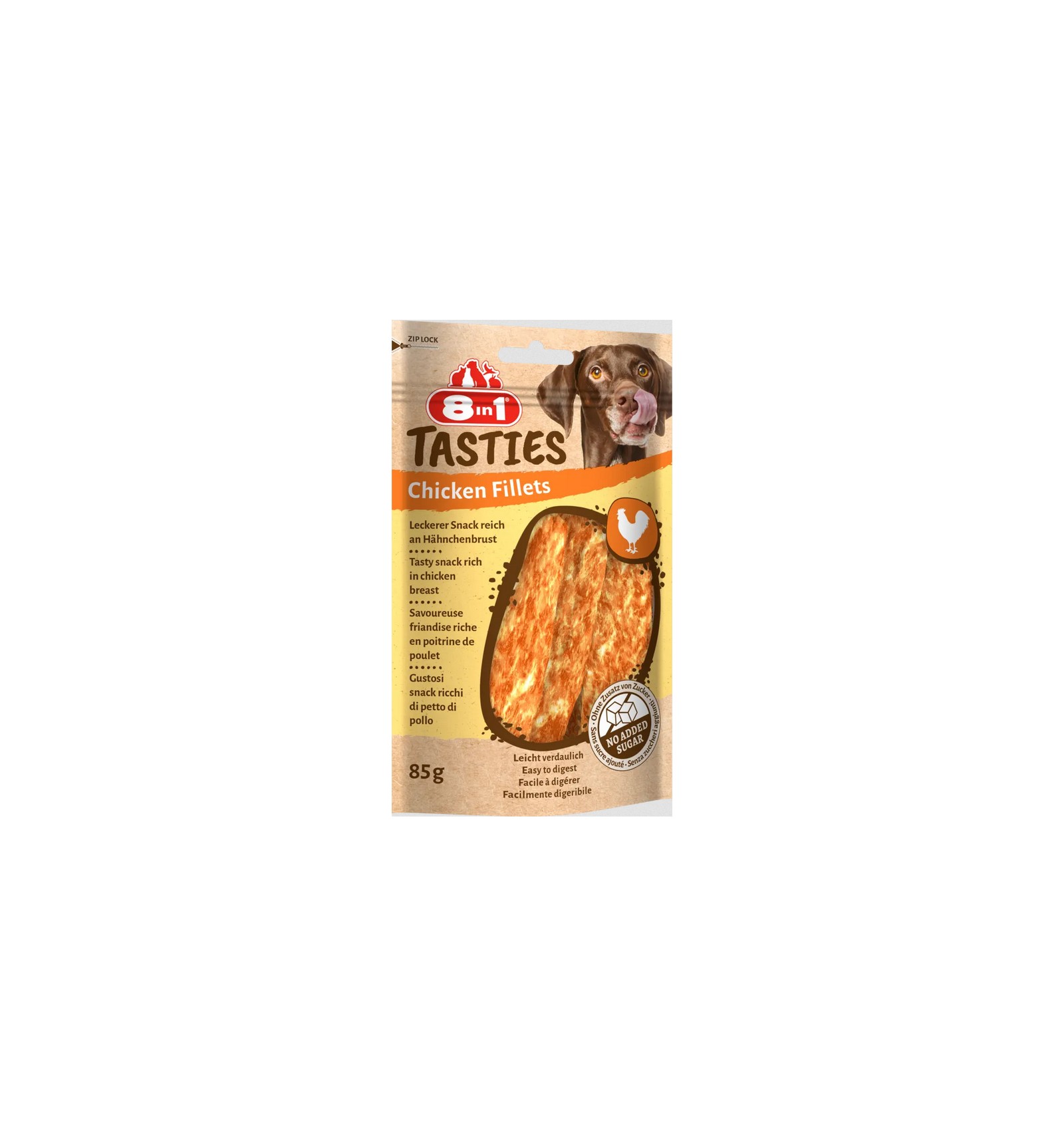 8in1 Tasties Chicken Fillets são lanches de carne gratificantes que seu cão vai adorar. Feito de delicioso peito de frango, estas guloseimas saudáveis e saudáveis são o lanche ideal para cães entre as refeições. Este lanche é rico em peito de frango e em proteínas. As proteínas ajudam a construir e manter a massa muscular magra para a condição corporal superior.