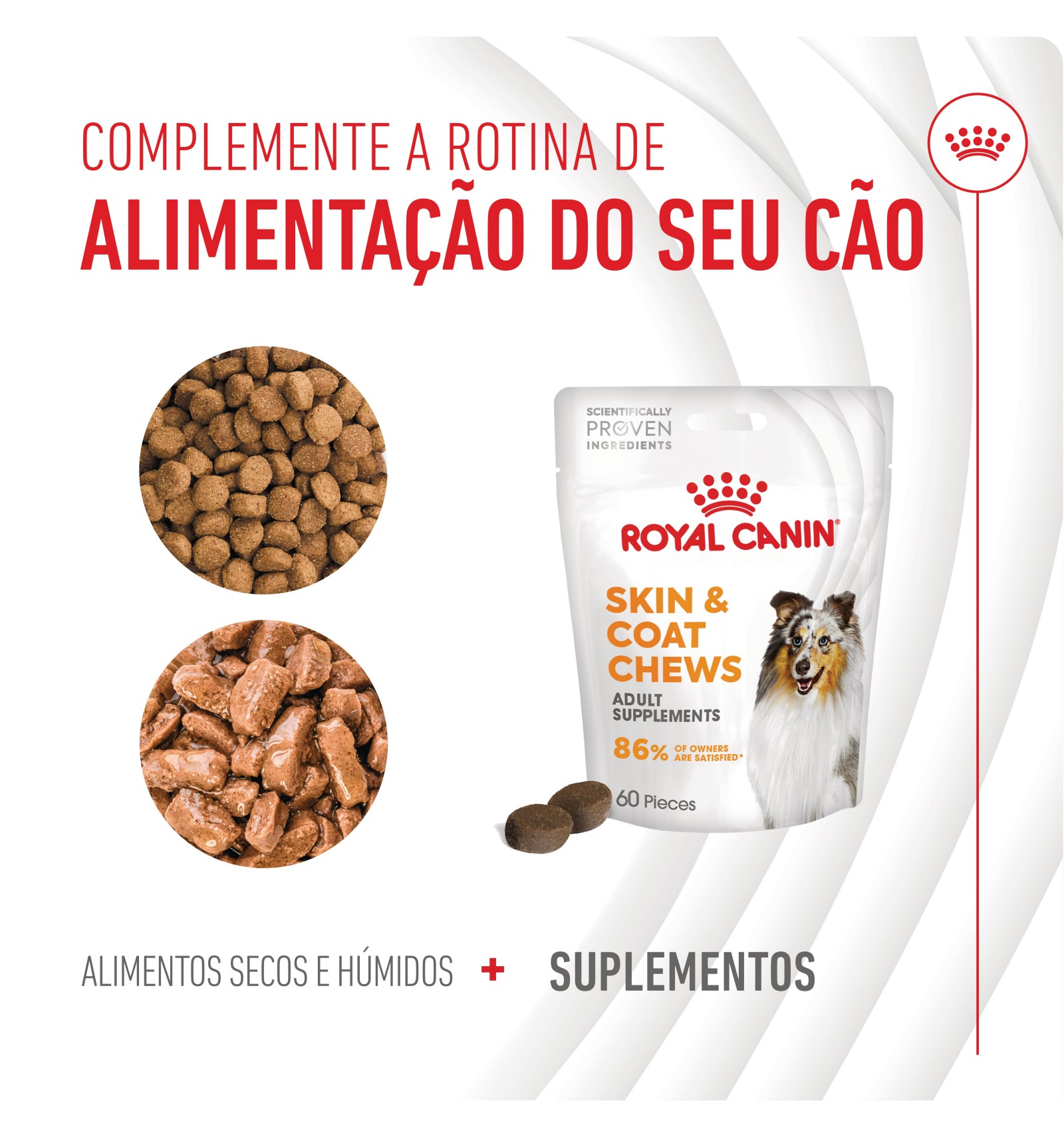 Combine-os com alimentos ROYAL CANIN® concebidos para animais de companhia saudáveisOs nossos suplementos mastigáveis são concebidos para complementar qualquer alimento dentro da gama ROYAL CANIN® concebida para cães saudáveis. Se o seu cão for alimentado com um alimento regular de manutenção, os ROYAL CANIN® SKIN & COAT CHEWS ADULT SUPPLEMENTS irão integrar-se perfeitamente na sua alimentação, apoiando a saúde cutânea e o brilho da pelagem. Isto permite ao seu cão que mantenha a sua rotina estabelecida de alimentação enquanto continua a receber um apoio específico para ajudar a manter a sua saúde.