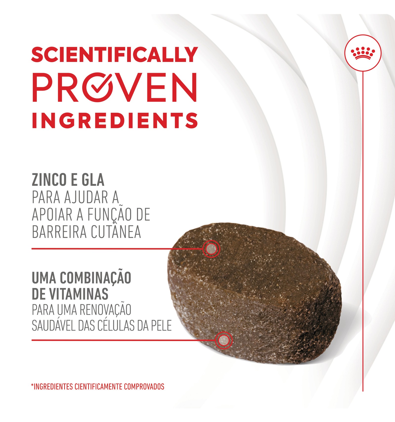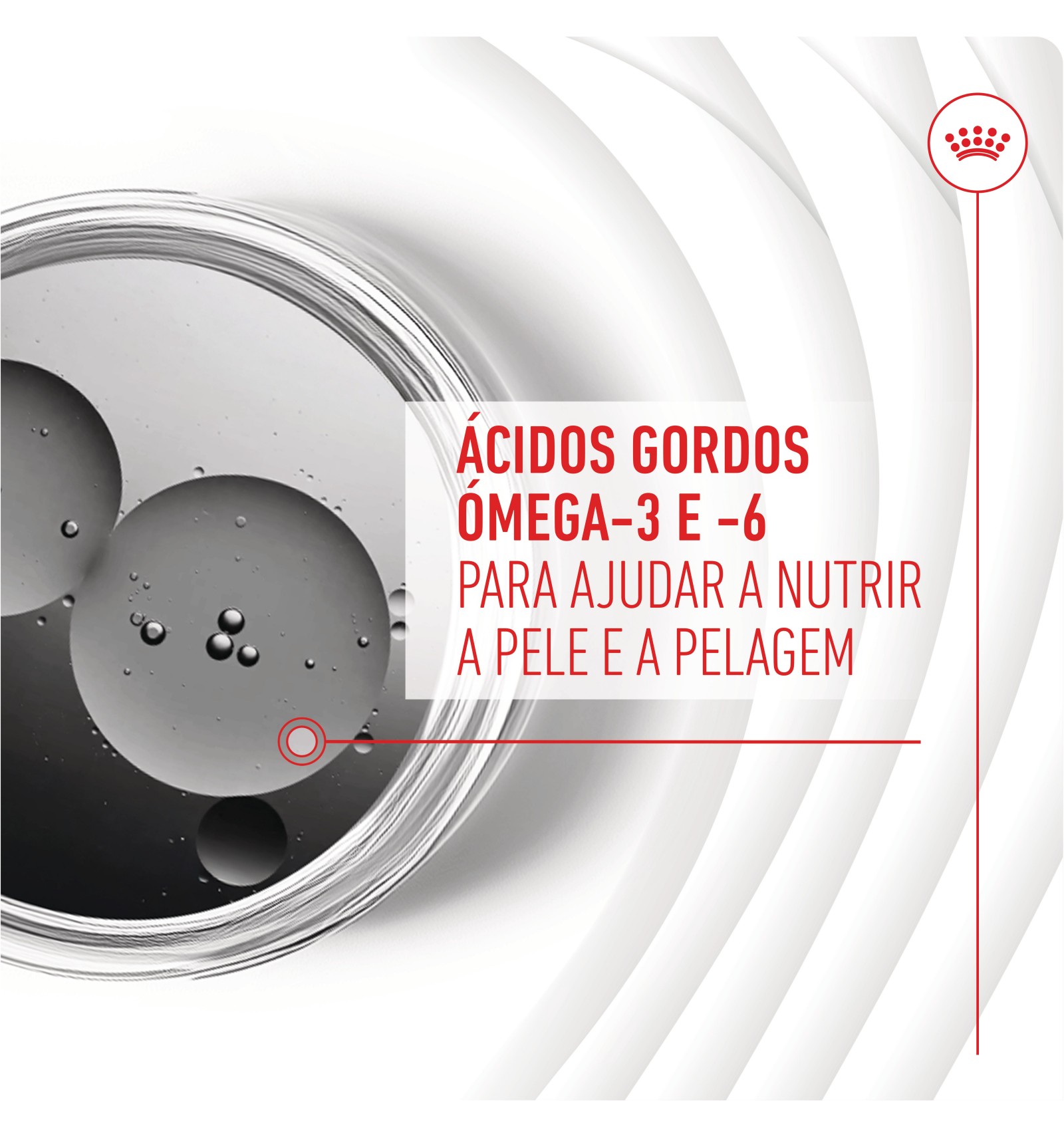 Apoiam a saúde da pele e da pelagemOs ROYAL CANIN® SKIN & COAT CHEWS ADULT SUPPLEMENTS são concebidos para ajudar a manter uma pele saudável e uma pelagem brilhante. Estes suplementos contêm ácidos gordos ómega-3 e ómega-6 para nutrir a pele e a pelagem, junto com zinco e GLA para apoiar a função de barreira cutânea. Além disso, incluem uma combinação de vitaminas para ajudar a promover uma renovação saudável das células da pele.