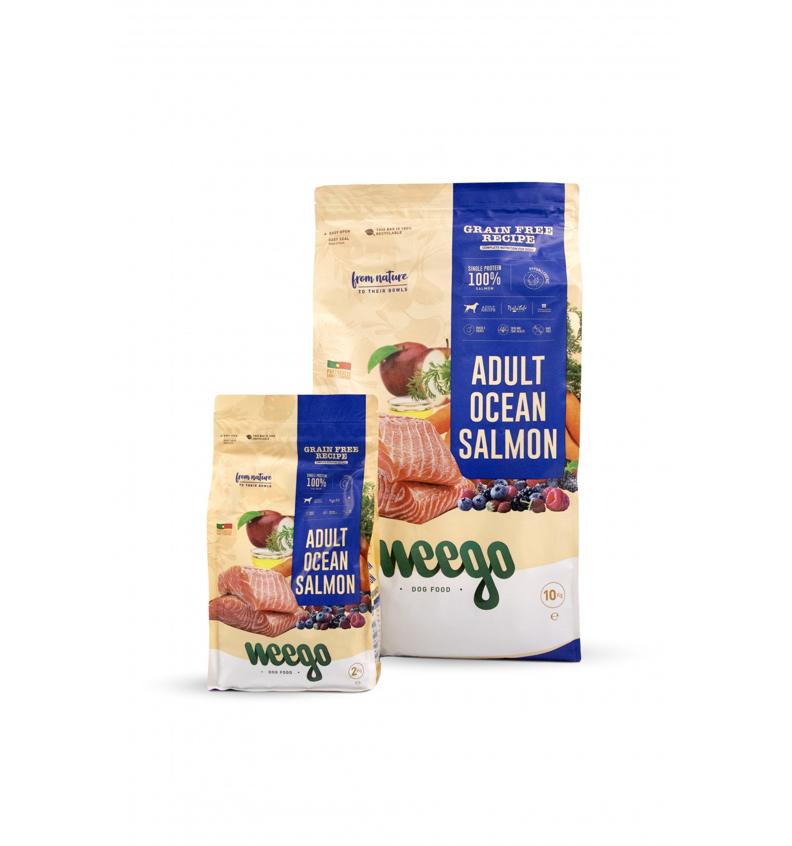Salmão hidrolisado (mín. 30%), batata, leguminosas (lentilha castelhana mín. 8%), batata doce, óleo de salmão rico em Ω3, levedura de cerveja Saccharomyces cerevisiae, farinha de alfarroba, maçã desidratada (mín. 1%), cenoura, abóbora, substâncias minerais, lignocelulose, extrato de yucca schidigera, complexo condroprotetor (cloridrato de glucosamina 1250 mg, sulfato de condroitina 850 mg/kg, extrato de mexilhão de lábios verdes Perna canaliculus), frutos silvestres, manano-oligossacarídeos, fruto-oligossacarídeos, ervas botânicas (calêndula, sálvia, feno-grego, endro, tomilho, flor de marigold, rosa mosqueta), taurina, prebióticos, extratos vegetais (frutas vermelhas, frutas cítricas, semente de cardo mariano, semente de chá verde, alecrim), antioxidantes naturais, probióticos (E. faecium NCIMB 10415 15x106 UFC), L-carnitina.