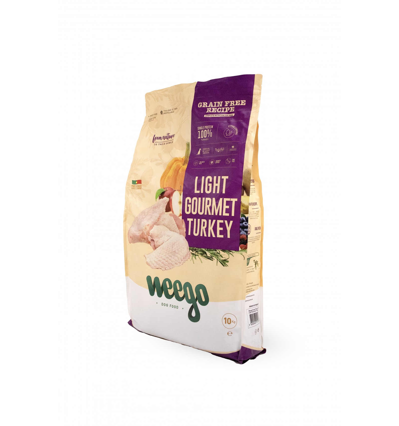 Peru hidrolisado (mín. 25%), batata, leguminosas, levedura de cerveja Saccharomyces cerevisiae (fonte de nucleotides, mananno-oligossacarídeos e β-glucanos 1-6), fibras vegetais (lignocelulose, fibra de maçã, chicória - fonte de insulina e fruto-oligossacarídeos), gordura de frango, óleo de peixe rico em Omega-3, vegetais (chicória, cenoura, fava verde, nabo), substâncias minerais, extrato de yucca schidigera, complexo condroprotetor (cloridrato de glucosamine 1250 mg/kg, sulfato de condroitina 835 mg/kg, extrato de mexilhão de lábios verdes Perna canaliculus), taurina, ervas botânicas (calêndula, sálvia, feno-grego, endro, tomilho, rosa mosqueta), prebióticos, extratos de plantas (frutos vermelhos, frutas cítricas, sementes de cardo mariano, sementes de chá verde, menta, alecrim), antioxidantes naturais, L-carnitina, probiotics (E. faecium NCIMB 10415 15x106 CFU).